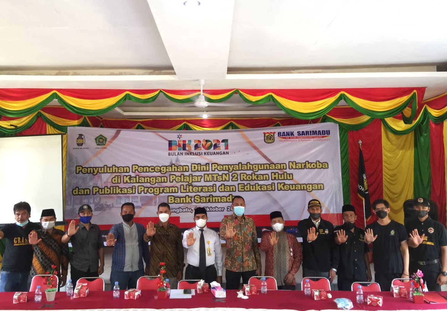 Banksarimadu.com. Ujungbatu. Dalam rangka kegiatan tahunan Bulan Inklusi Keuangan (BIK) selama bulan Oktober 2021, dan dalam rangka ikut serta berperan aktif membantu program pemerintah untuk mengantisipasi Penyalahgunaan Narkotika, Bank Sarimadu berkolaborasi dengan Dewan Pimpinan Cabang (DPC) Gerakan Nasional Anti Narkotika (GRANAT) Kabupaten Rokan Hulu (Rohul) menyelenggarakan kegiatan yang bertemakan Penyuluhan Pencegahan Dini Penyalahgunaan Narkoba di Kalangan Pelajar MtsN 2 Rokan Hulu dan Publikasi Program Literasi dan Edukasi Keuangan Bank Sarimadu. Acara dilaksanakan di wilayah kerja Bank Sarimadu Cabang Ujungbatu bertempat di Aula Madrasah Tsanawiyah Negri 2 Rokan Hulu, Kecamatan Ujungbatu, Rokan Hulu Riau pada hari Sabtu 16 Oktober 2021.